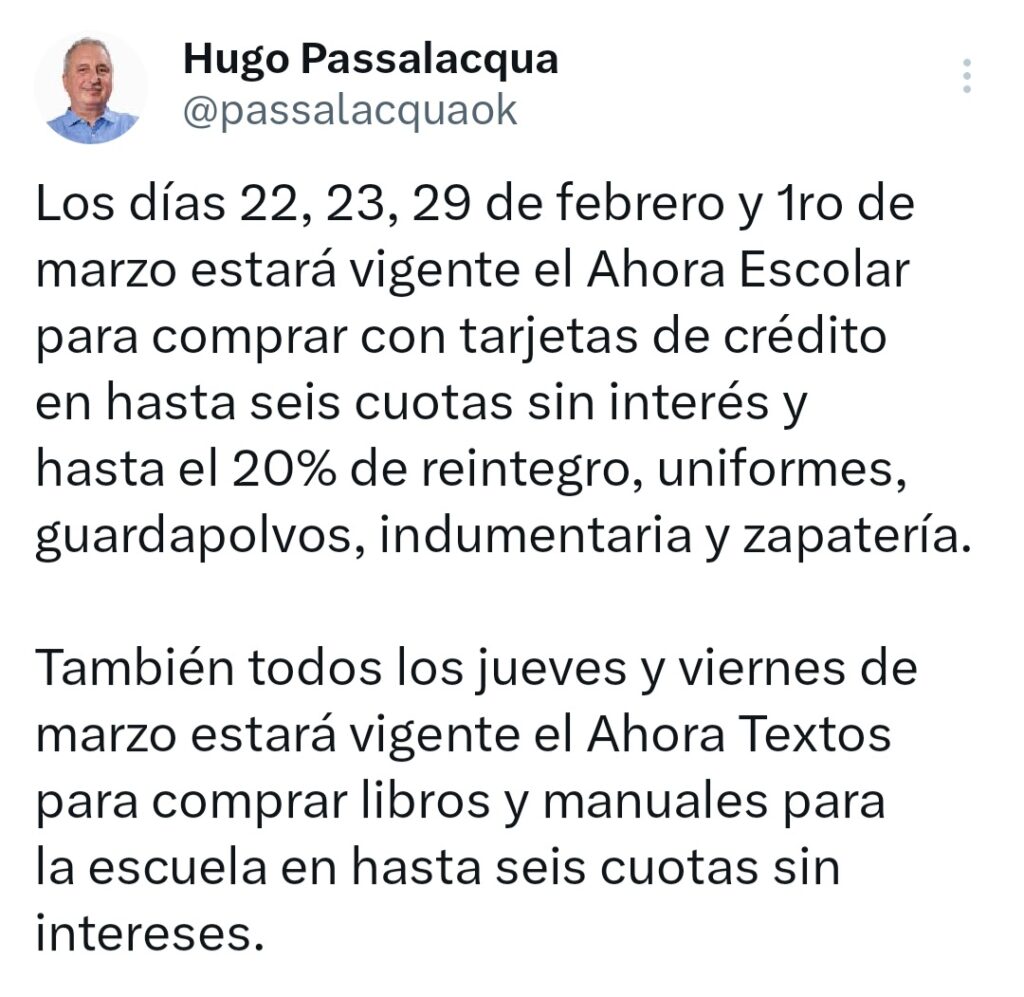 Passalacqua anunció que los días 22, 23, 29 de febrero y 1ro de marzo estará activo el programa Ahora Escolar. Este programa permitirá a los ciudadanos realizar compras con tarjetas de crédito en hasta seis cuotas sin interés, además de contar con un reintegro de hasta el 20%. Los productos incluidos en esta iniciativa abarcan uniformes, guardapolvos, indumentaria y zapatería, elementos fundamentales para el regreso a clases.
