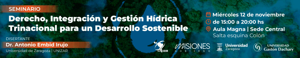El próximo miércoles 12 de noviembre se realizará en la ciudad de Posadas el Seminario “Derecho, Integración y Gestión Hídrica Trinacional para un Desarrollo Sostenible”, una jornada que reunirá a referentes académicos y especialistas de Argentina, Paraguay, Brasil y España para debatir sobre los desafíos comunes que enfrenta la gestión del agua en territorios compartidos.