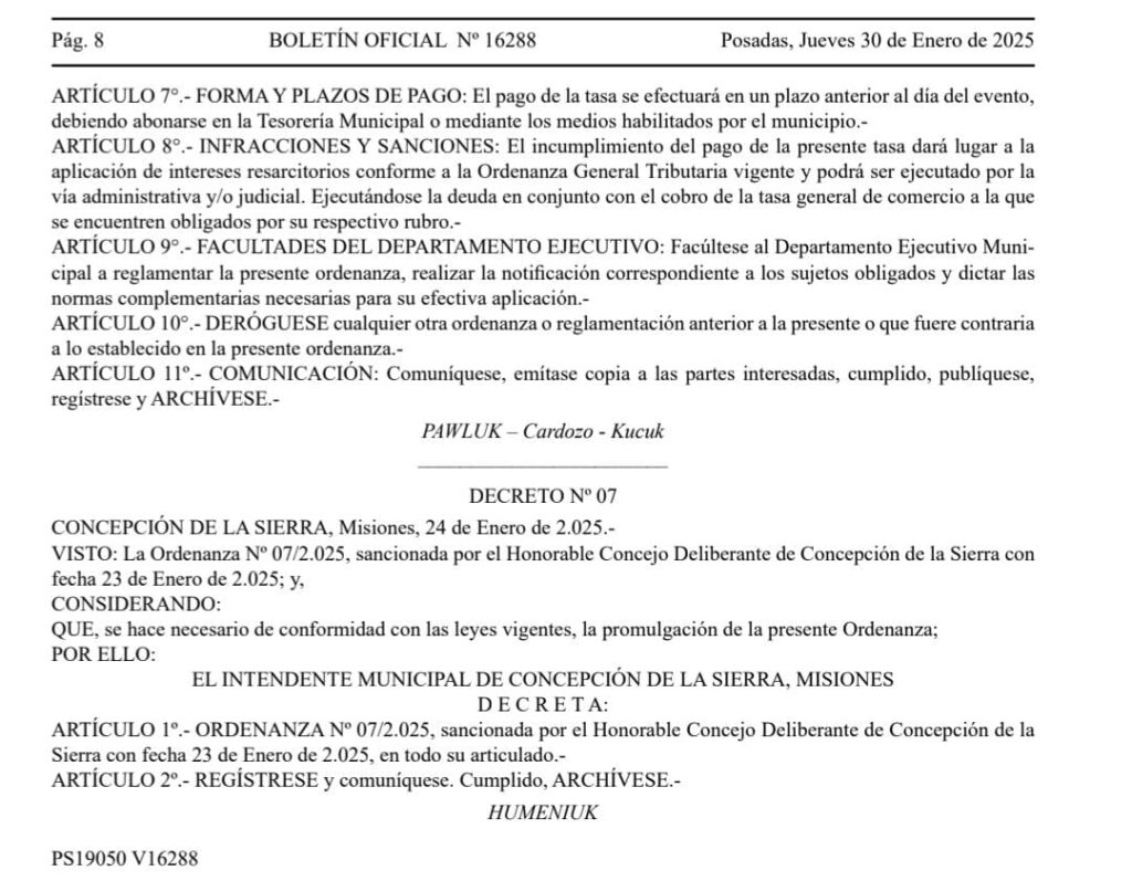 El 23 de enero de 2025, el Concejo Deliberante de Concepción de la Sierra, Misiones, sancionó la Ordenanza N° 07, creando una nueva “Tasa por Servicios Especiales de Carnaval” destinada a cubrir los gastos extraordinarios del municipio durante la realización del evento de Carnaval en la avenida Barrufaldi, entre las calles Andresito y Sáenz Peña.